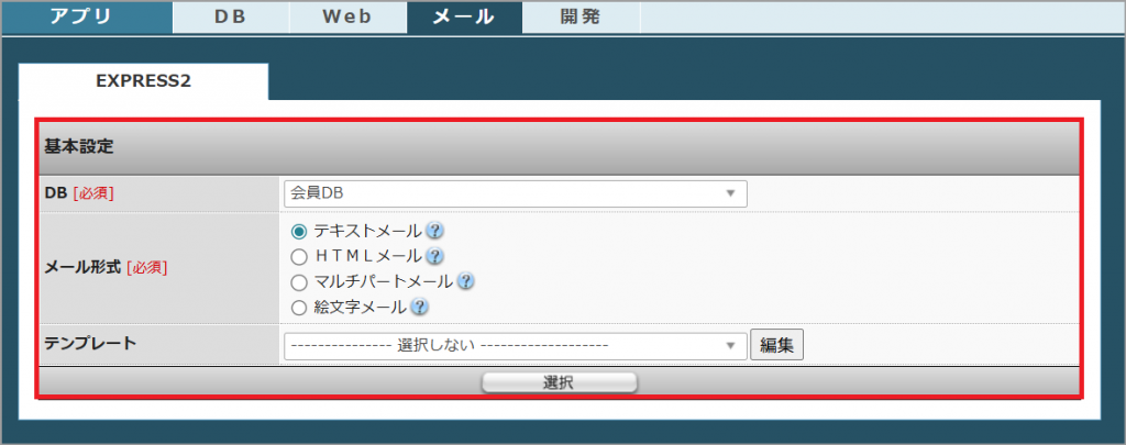 | DB[必須] | 配信するDBを選択します。 ※ メールアドレスフィールドが存在しないDB、EXPRESS2が使用できないDB(トランザクションDB等)は表示されません。 |