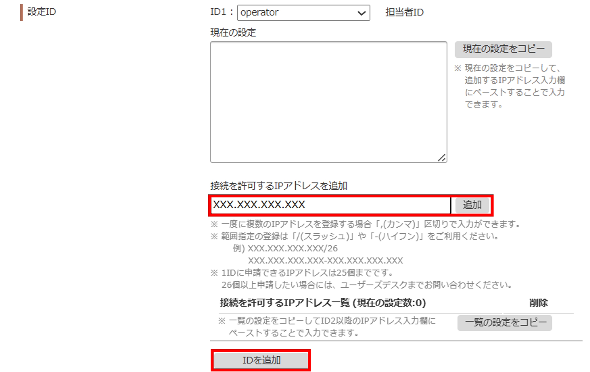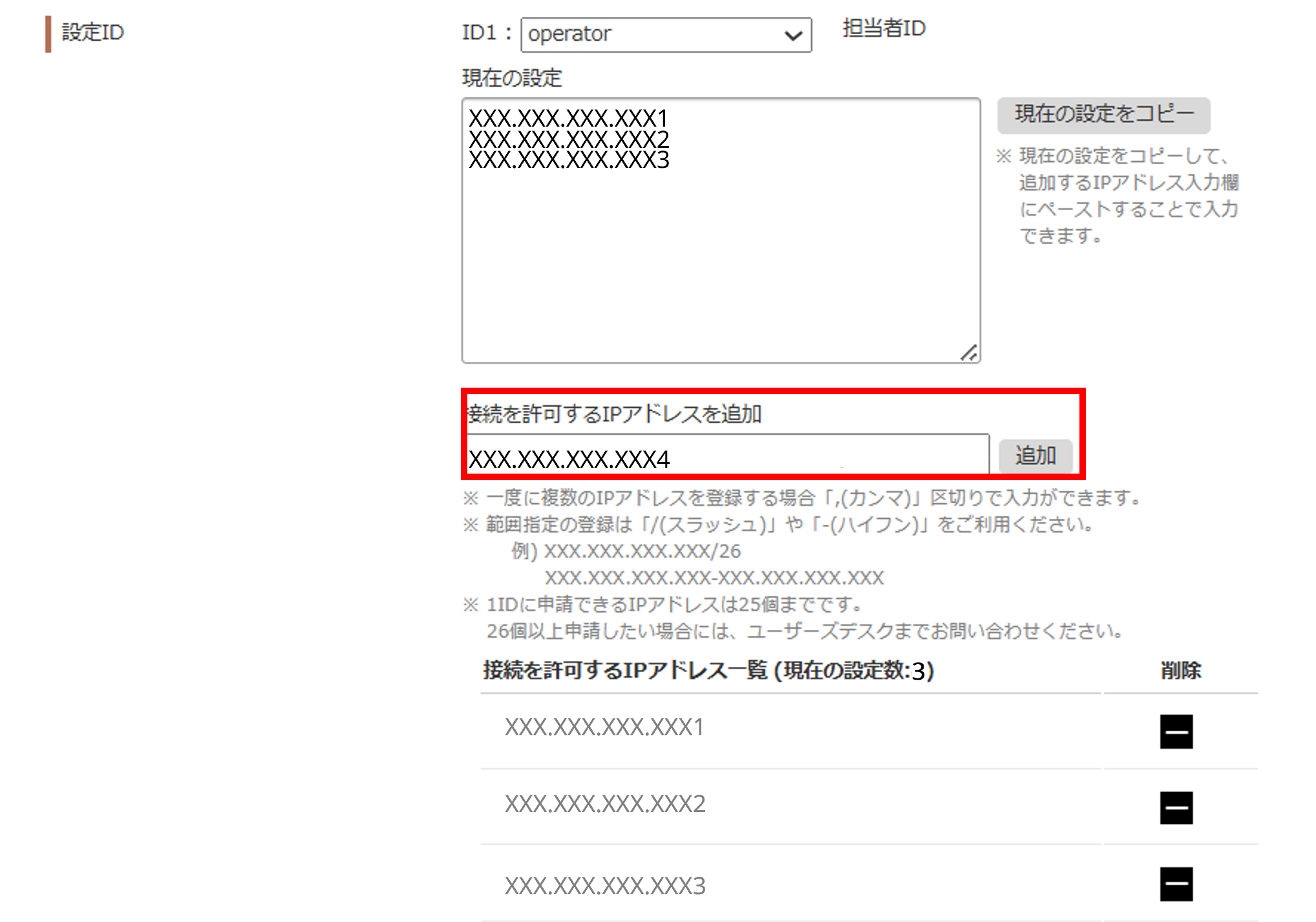 IPアドレスを追加する場合は、現在設定済みのIPアドレスもあわせて申請する必要があります。