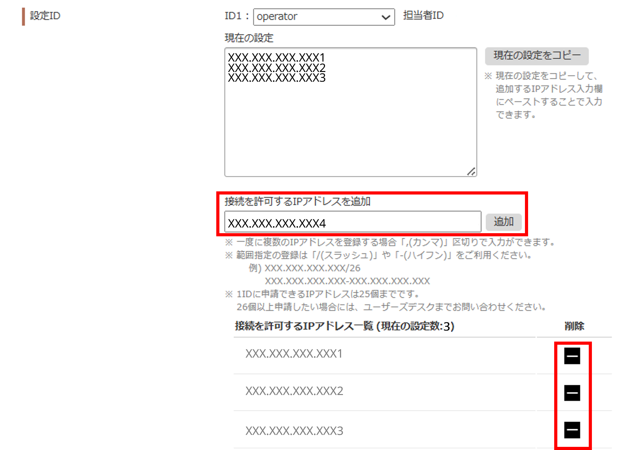 「接続を許可するIPアドレス一覧」から、削除したいIPアドレスの[ー]ボタンをクリックして削除します。