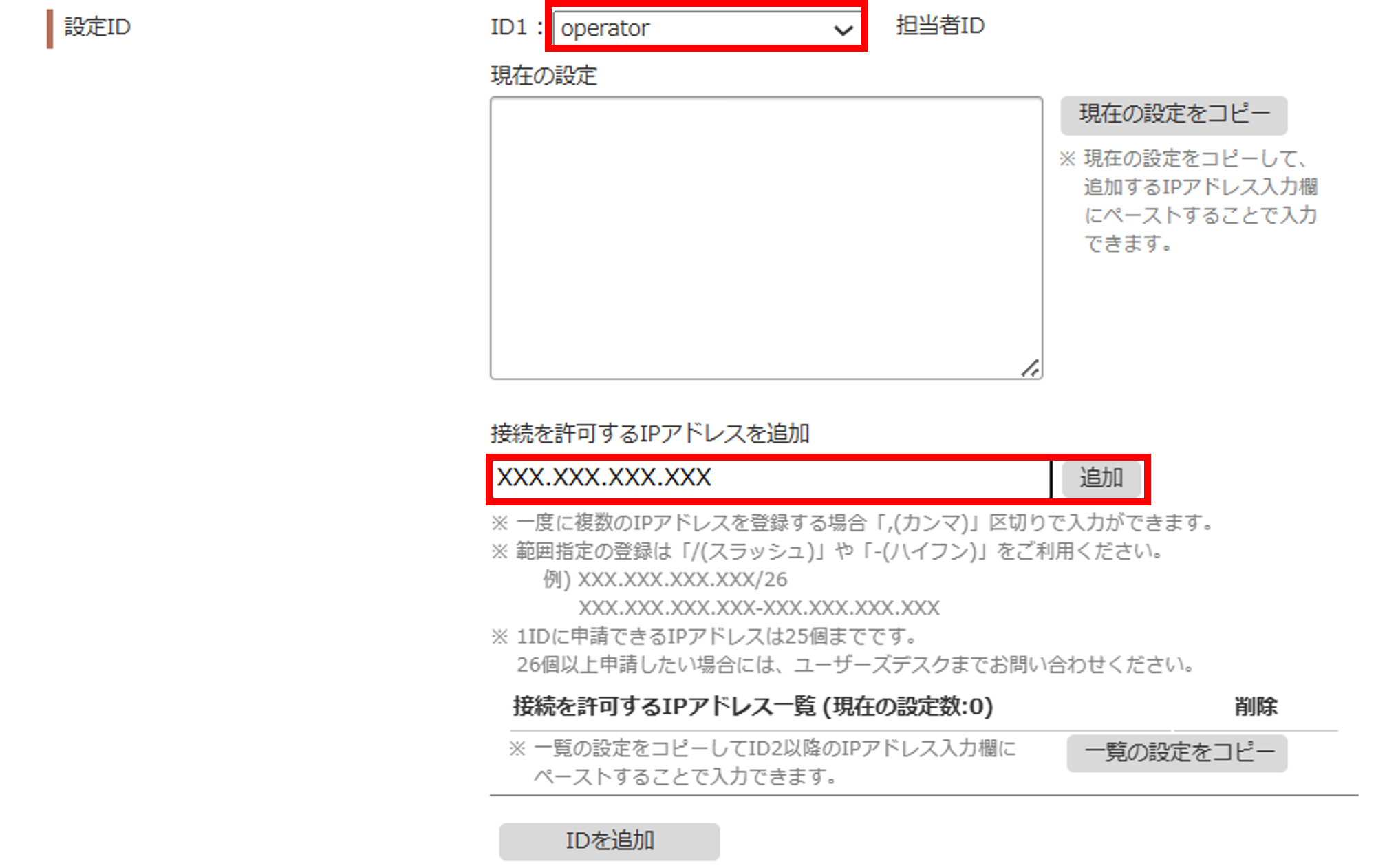 「設定ID」の「ID1」から IPアドレスを設定したいIDを選択し、「接続を許可するIPアドレスを追加」に設定したいIPアドレスを記入の上、[追加ボタン]をクリックします。