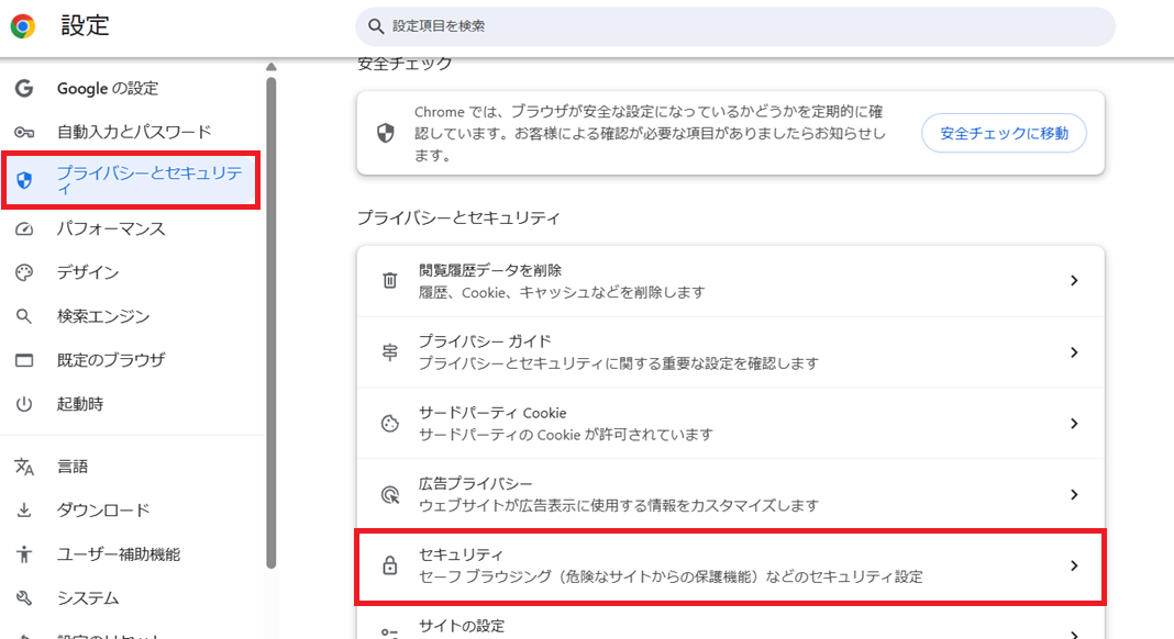ブラウザの設定画面より、プライバシーとセキュリティからセキュリティ をクリックします。