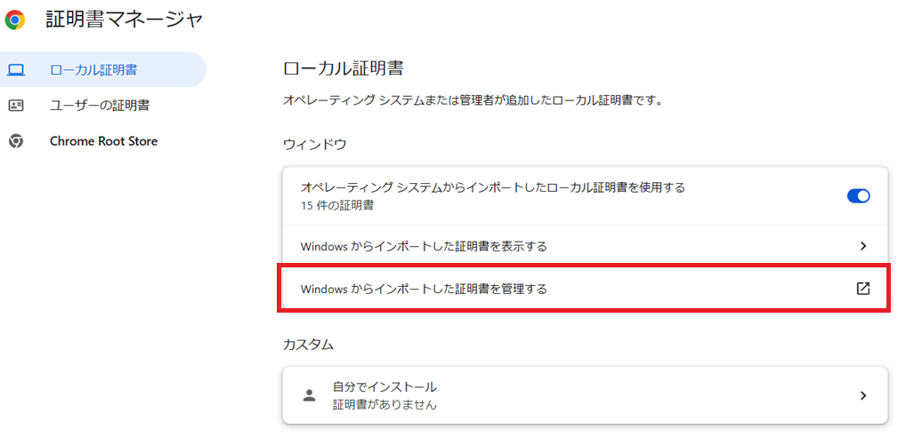 Windowsからインポートした証明書を管理する をクリックします。