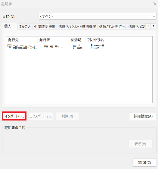 証明書ダイアログのインポートボタンをクリックします。