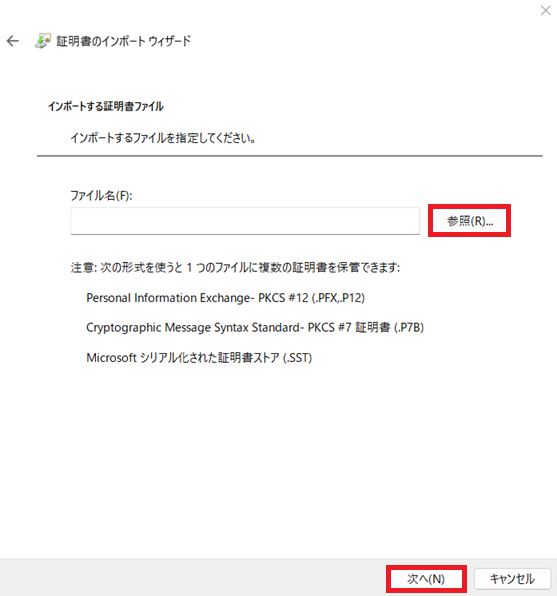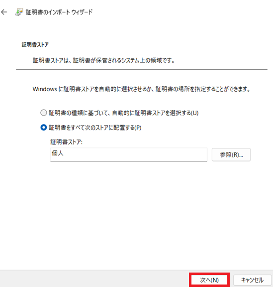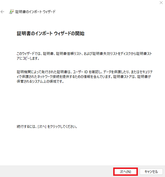 証明書のインポートウィザードダイアログの次へボタンをクリックします。