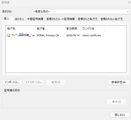 「個人」ストアに「SPIRAL Primary CA」が署名(発行)した証明書が保存されていることを確認します。