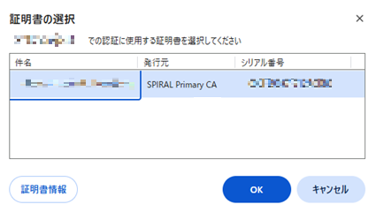 クライアント認証用のログインページにアクセスすると、クライアント認証の提示を求めるダイアログが開きます。