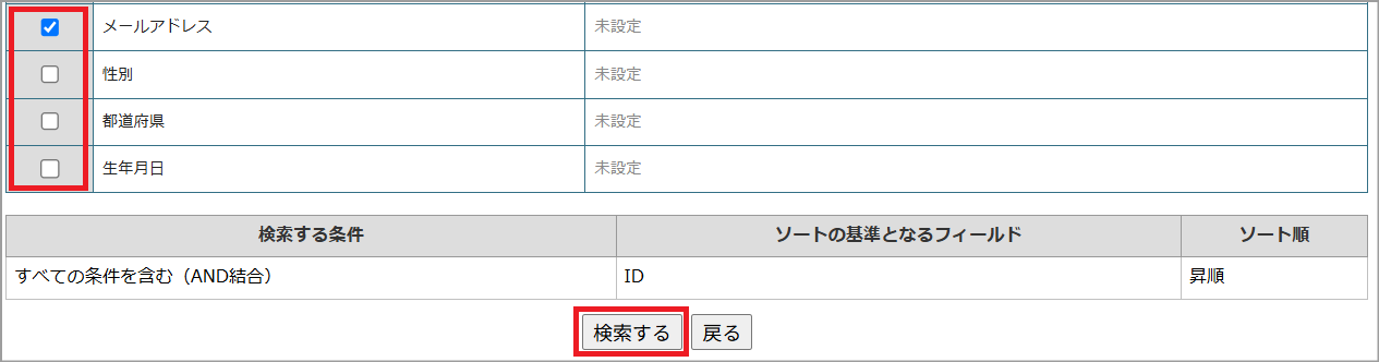 3.一覧表示させたいフィールドの「一覧表示」のチェックボックスにチェックを入れ、[検索する]を押します。