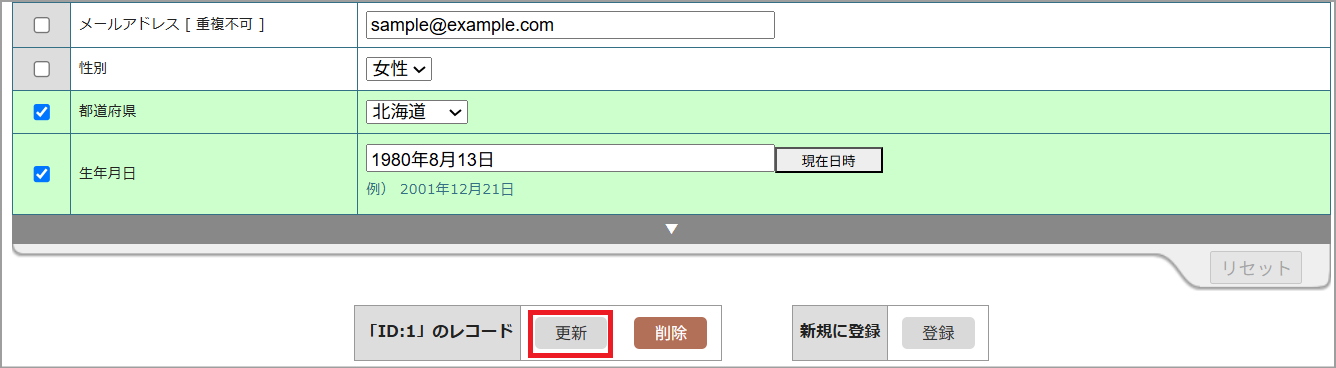 5.選択したデータが表示されますので、上書きしたい内容を入力または削除し、更新するフィールドの左側にチェックを入れ、[更新]ボタンをクリックします。