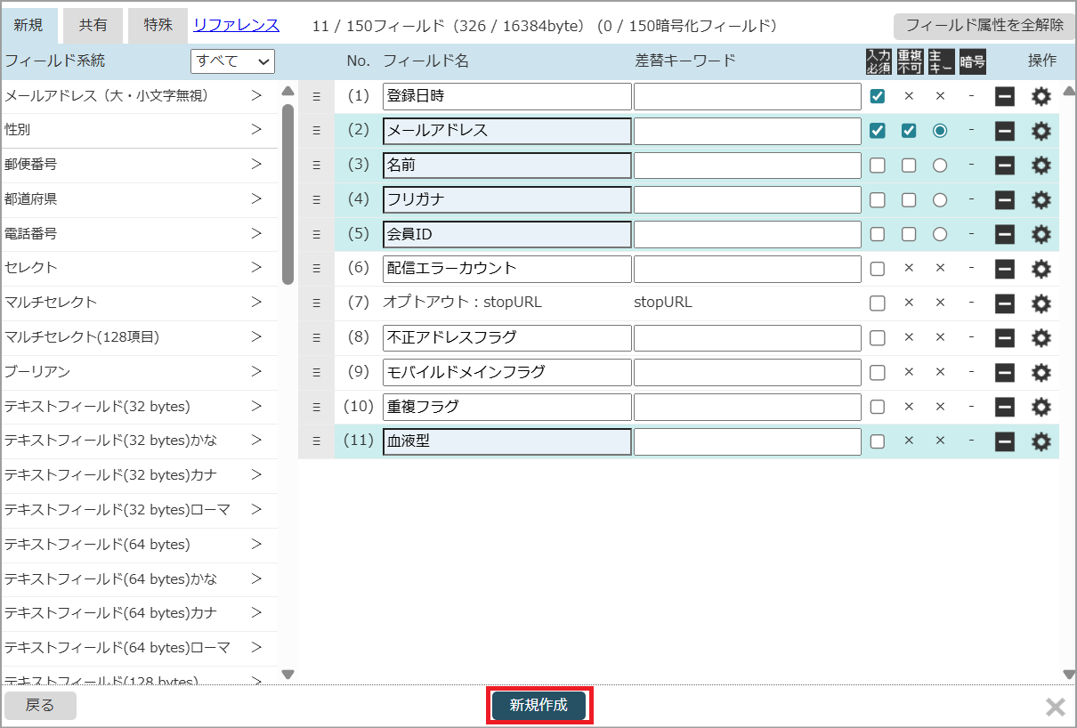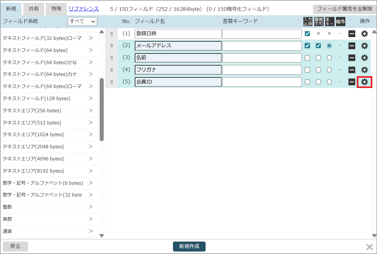 設定完了後、フィールドの詳細設定画面を閉じて「新規作成ボタン」よりDBを新規作成します。