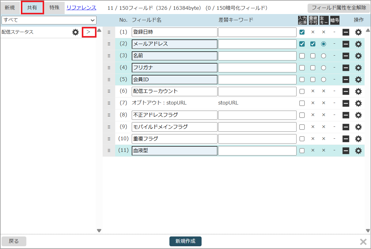 (DBに共有フィールドが含まれている場合、「共」のステータスが「◯」と表示されています。)