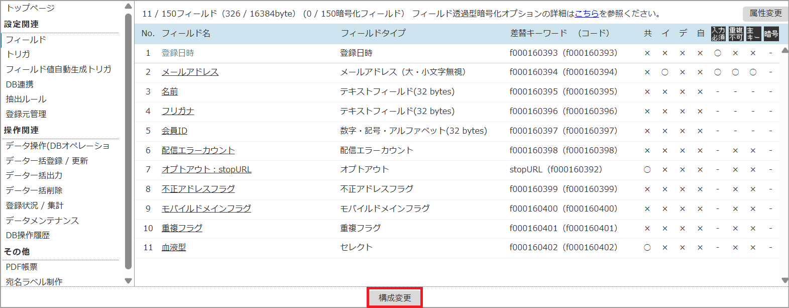 1. DB>「通常DB」>「通常DB一覧」から適当なDBを選択し、「基本設定」画面の左メニュー「フィールド」をクリックします。