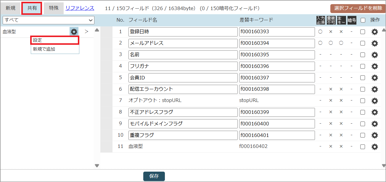3. 「共有」タブをクリックすると作成済みの共有フィールドが表示されます。編集したい共有フィールドの歯車マークをクリックし、「設定」を選択します。