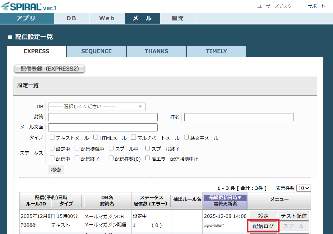配信設定一覧の画面にて「EXPRESS]を選択し、表示される一覧から「配信ログ」をダウンロードしてください。