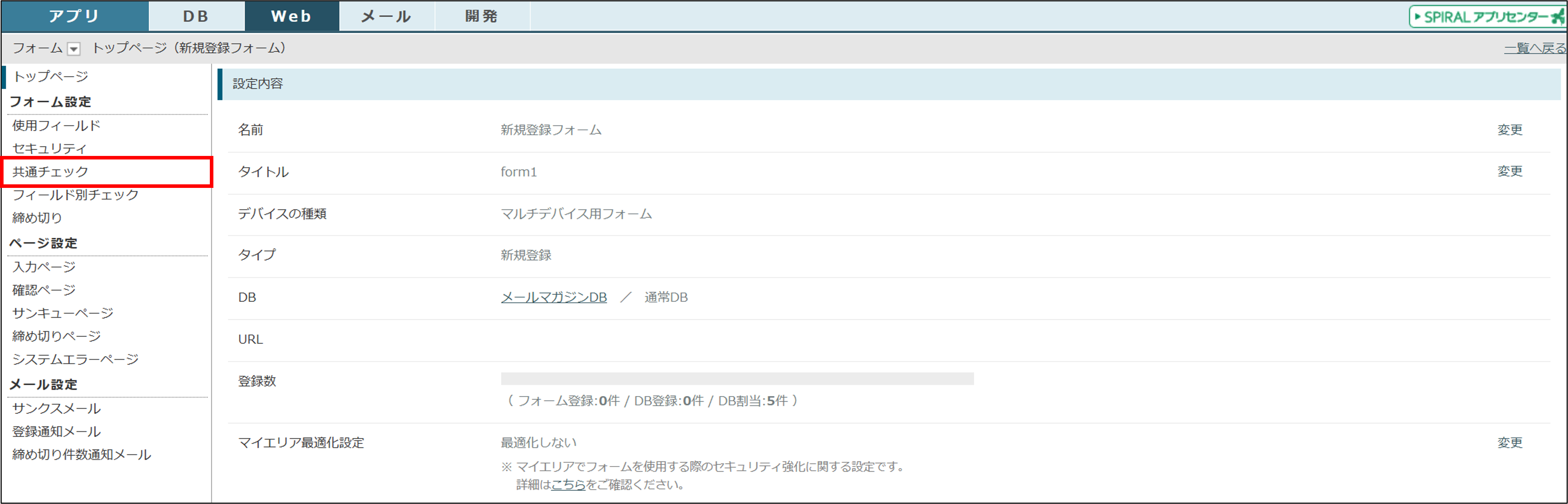 [Web]>[フォーム]>「フォーム一覧」画面に進み、対象のフォームを選択します。画面左の「Menu」>「フォーム設定」にある「共通チェック」をクリックします。