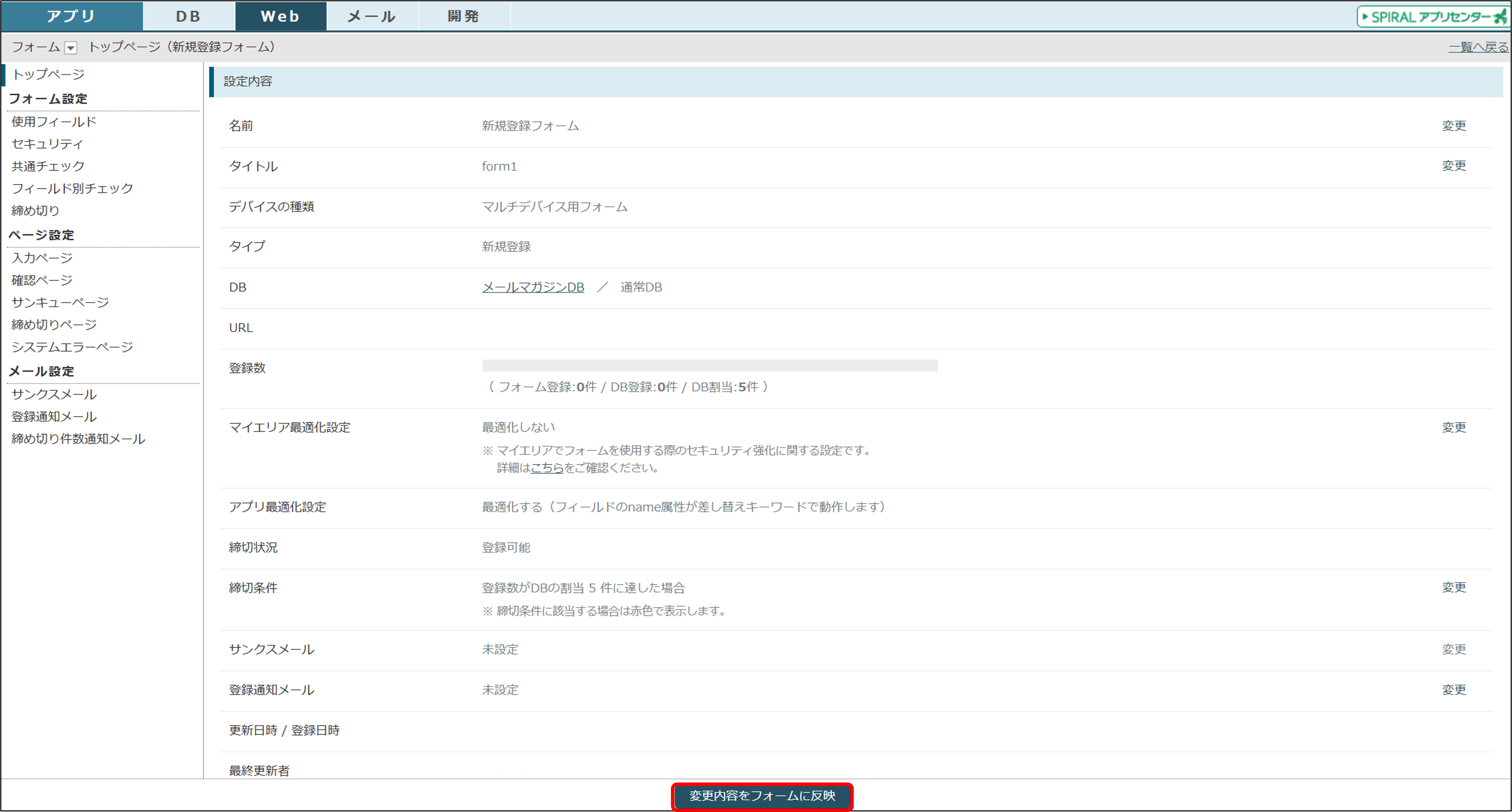 ※変更をフォームに反映するには、トップページから 「変更を反映」 ボタンを押してください。