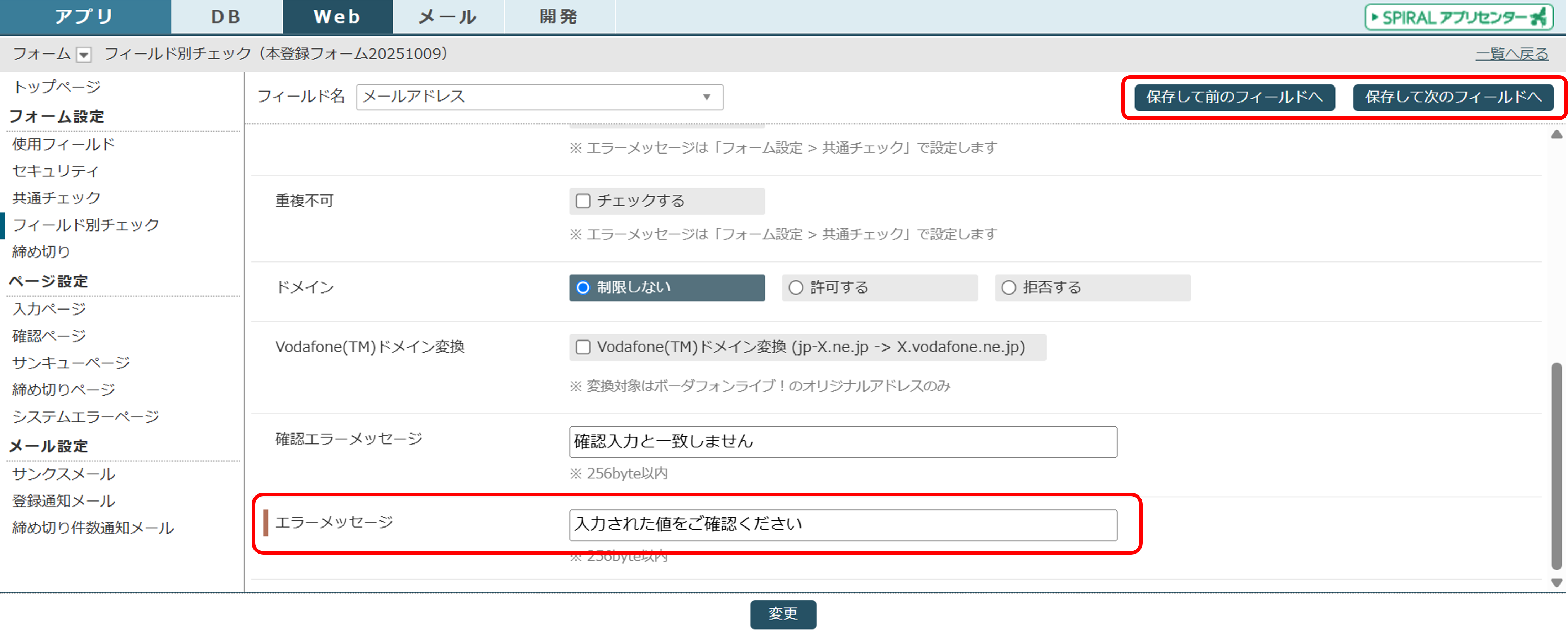 フィールド別エラーメッセージの設定は、「フィールド別チェック設定」にて行います。