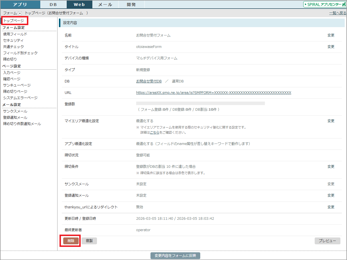 あるいは、削除したいフォームのフォーム名をクリック後、トップページにある「削除」ボタンをからも削除が可能です。