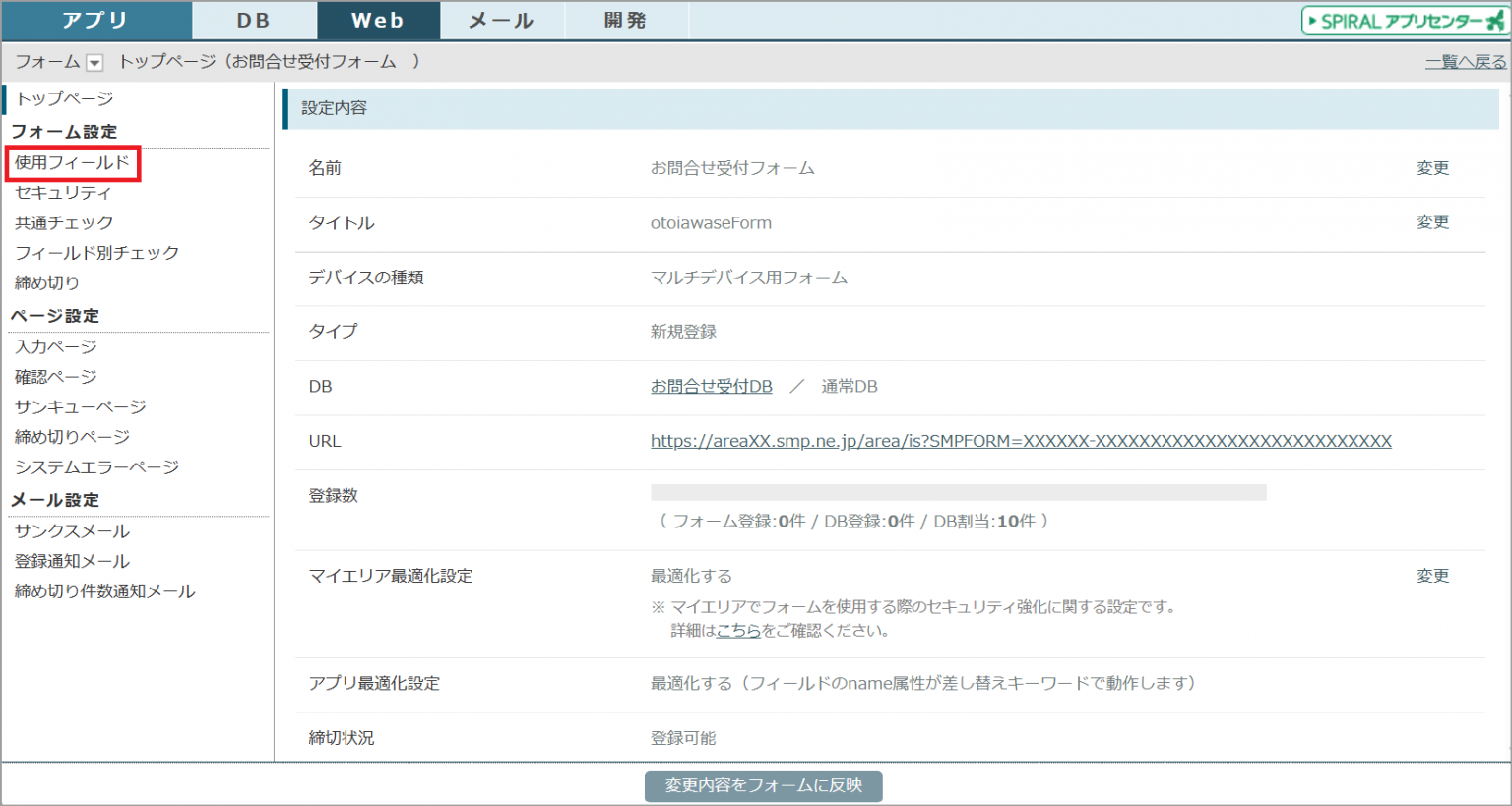 画面下部の「変更内容をフォームに反映」ボタンをクリックし、稼働中のフォームに変更内容を反映します。