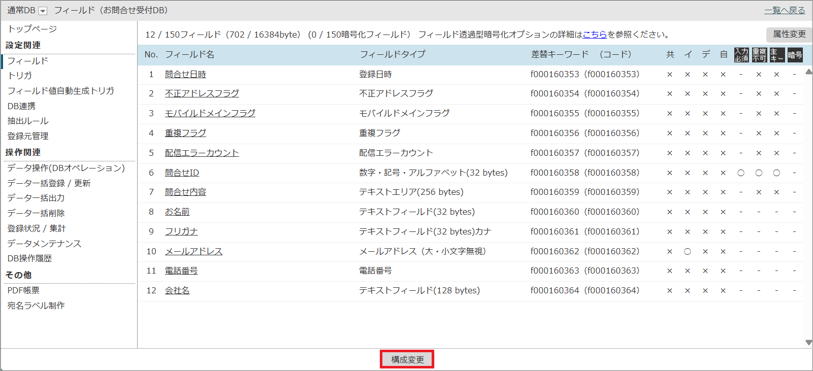 左メニュー「フィールド」をクリックし、「構成変更」へ進みます。