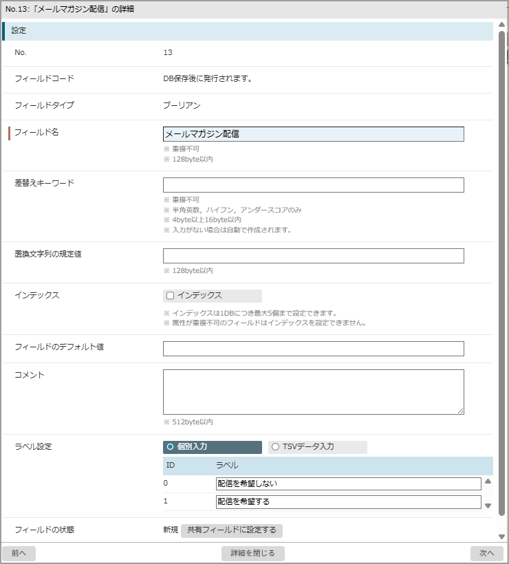 ※ここでフィールド属性を変更した場合、該当DBに紐づいて作成されたフォームの設定(フィールドチェック)を手動で設定しなければならない可能性があるので、作成済みDBのフィールド属性を変更する場合は注意が必要です。