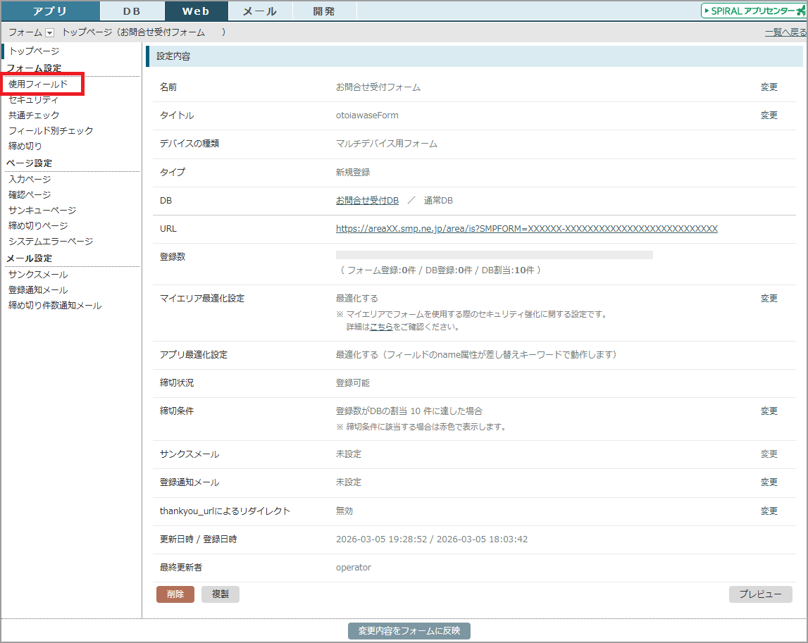 「Web」メニューから「フォーム」を選択し、一覧から対象のフォームを選択します。