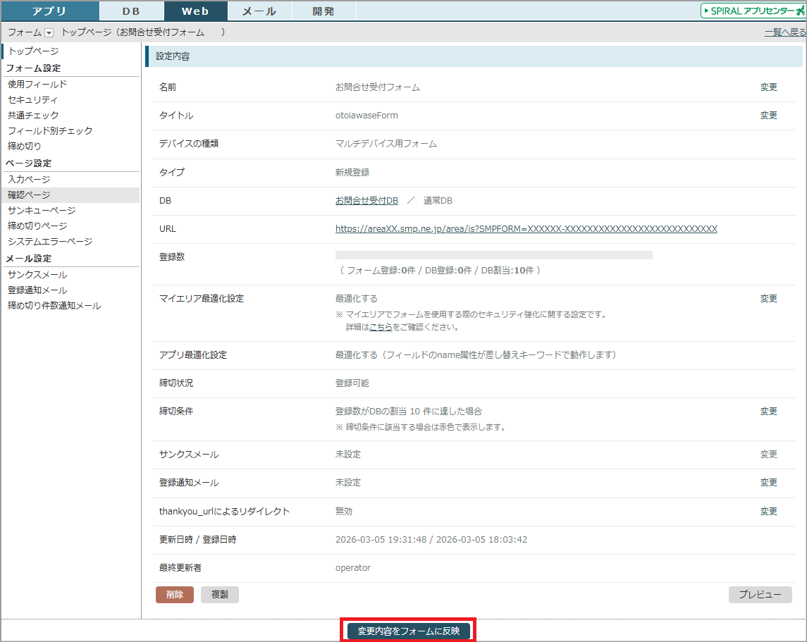 画面下部の「変更内容をフォームに反映」ボタンをクリックし、稼働中のフォームに変更内容を反映します。