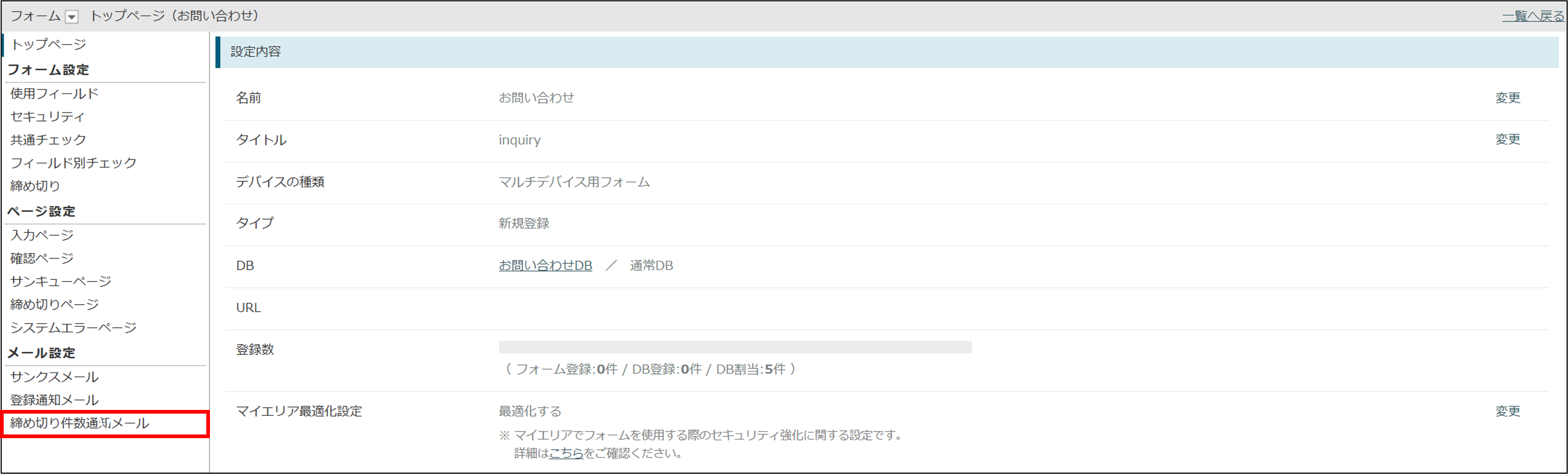 1.Web>フォームから該当フォームの「締め切り件数通知メール」をクリック。