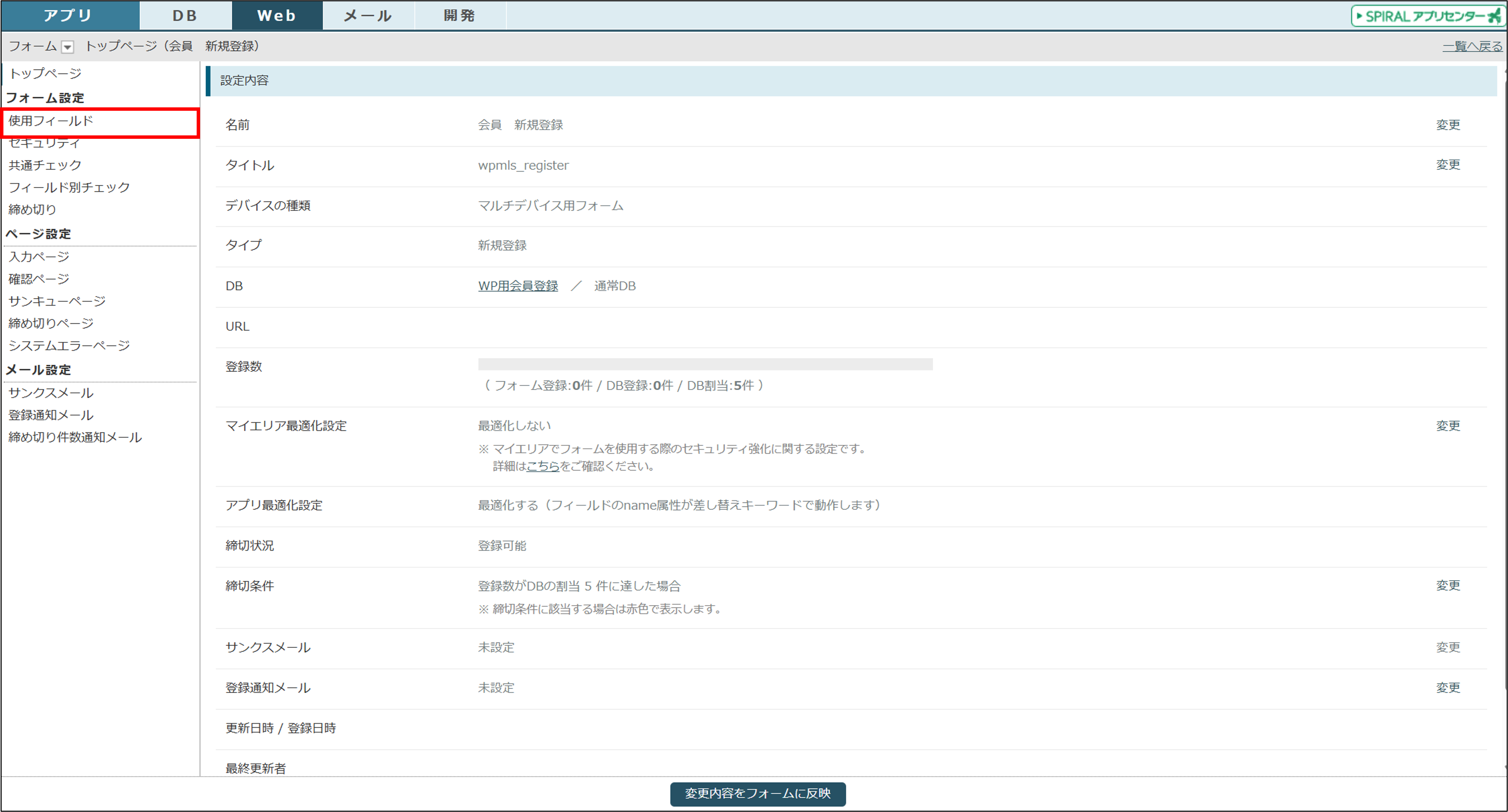 「Web」メニューから「フォーム」を選択し、一覧から対象のフォームを選択します。