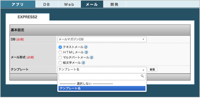 [メール]>[EXPRESS2]に進みます。「DB」と「メール形式」を指定し、[編集]ボタンをクリックします。