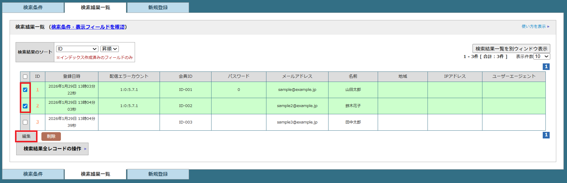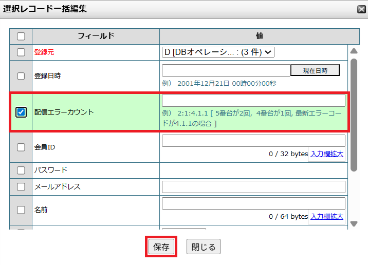 選択レコード一括編集画面にて、該当の配信エラーカウント左側にチェックし、空欄で「保存」ボタンをクリックします。