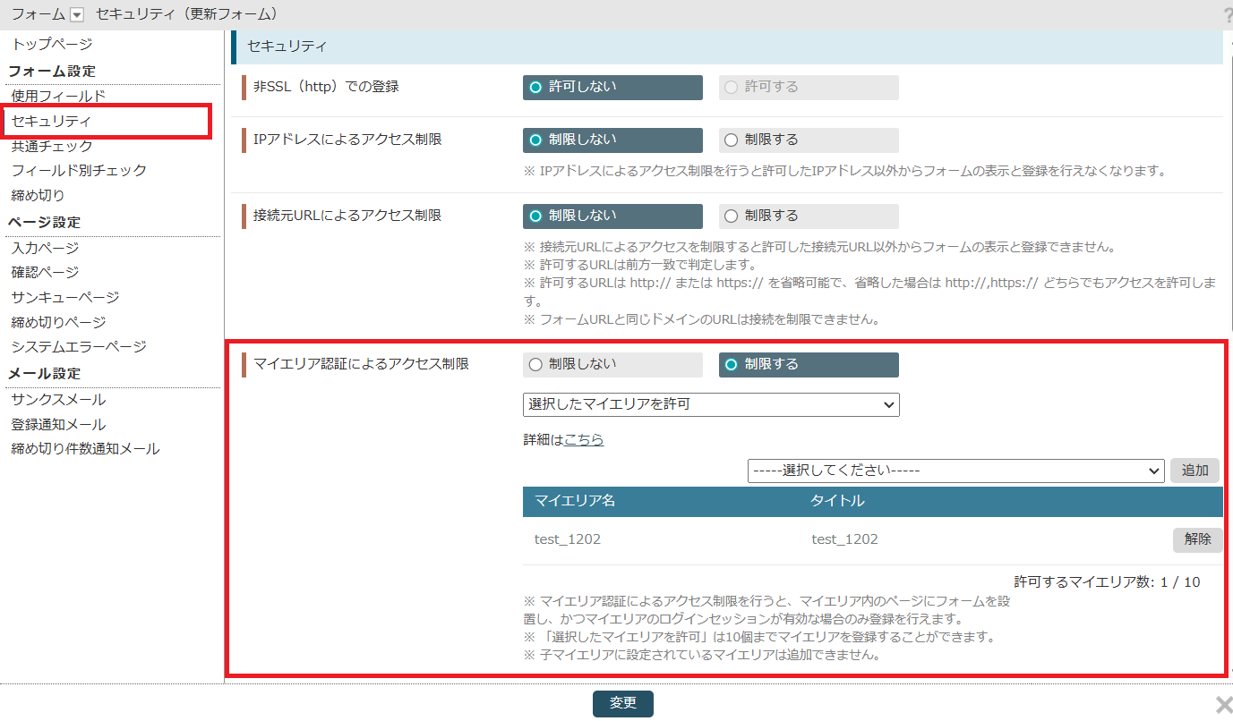 ※詳細は、「フォームの「マイエリア認証によるアクセス制限」で「選択したマイエリアを許可」を設定したい」をご参照ください。
