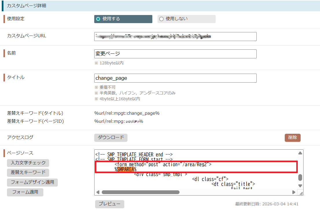 カスタムページ詳細画面よりページソースを設定し、「変更」ボタンを押します。