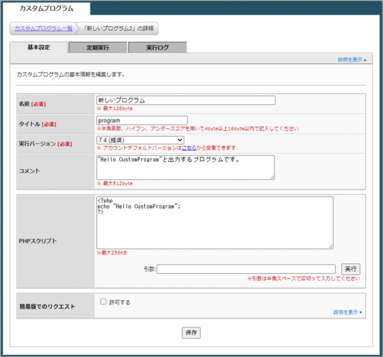 名前、タイトル、実行バージョン、PHPスクリプトのテンプレートを入力し「作成」ボタンをクリックするとカスタムプログラムが新規作成されます。