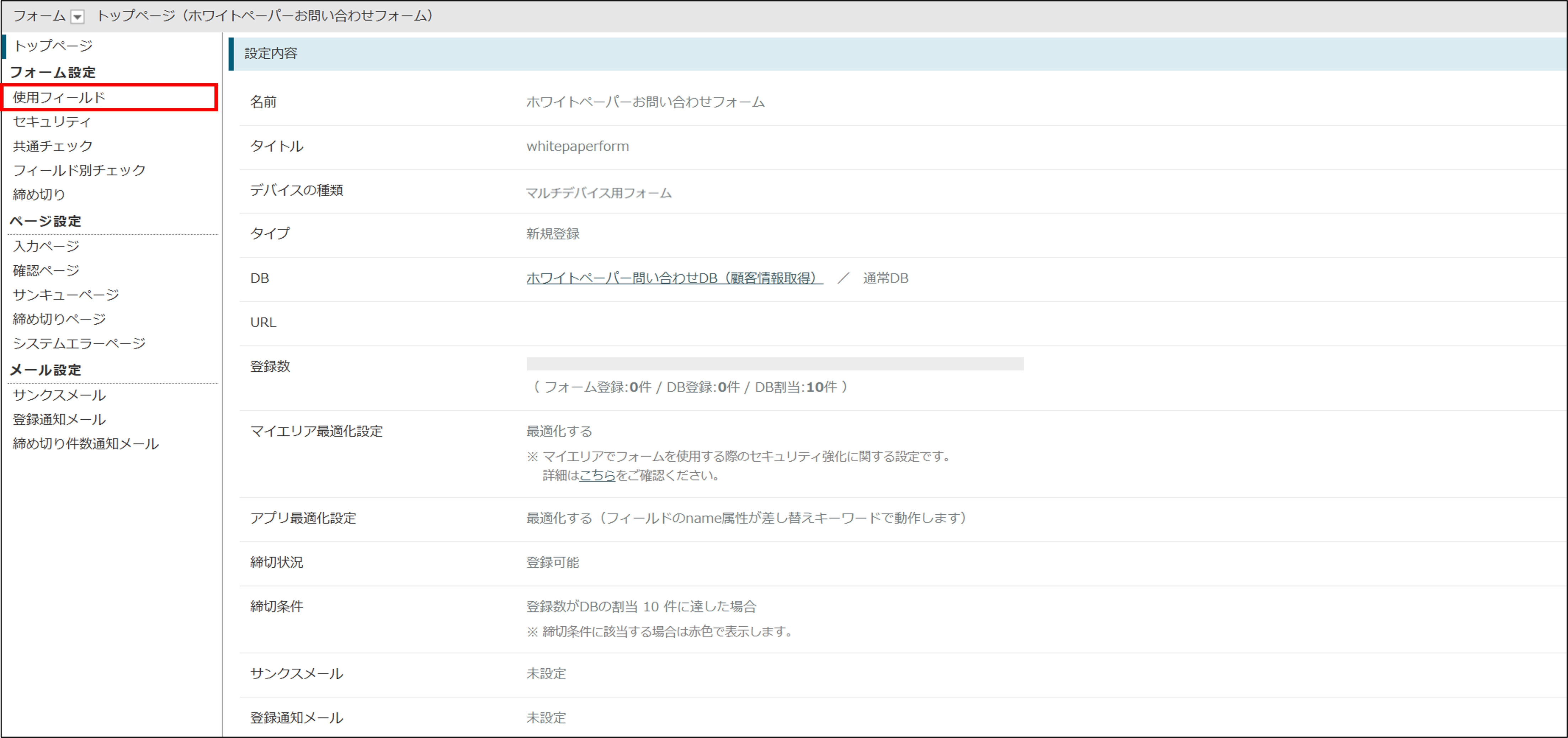 「MENU」>「フォーム設定」の「使用フィールド」に進みます。