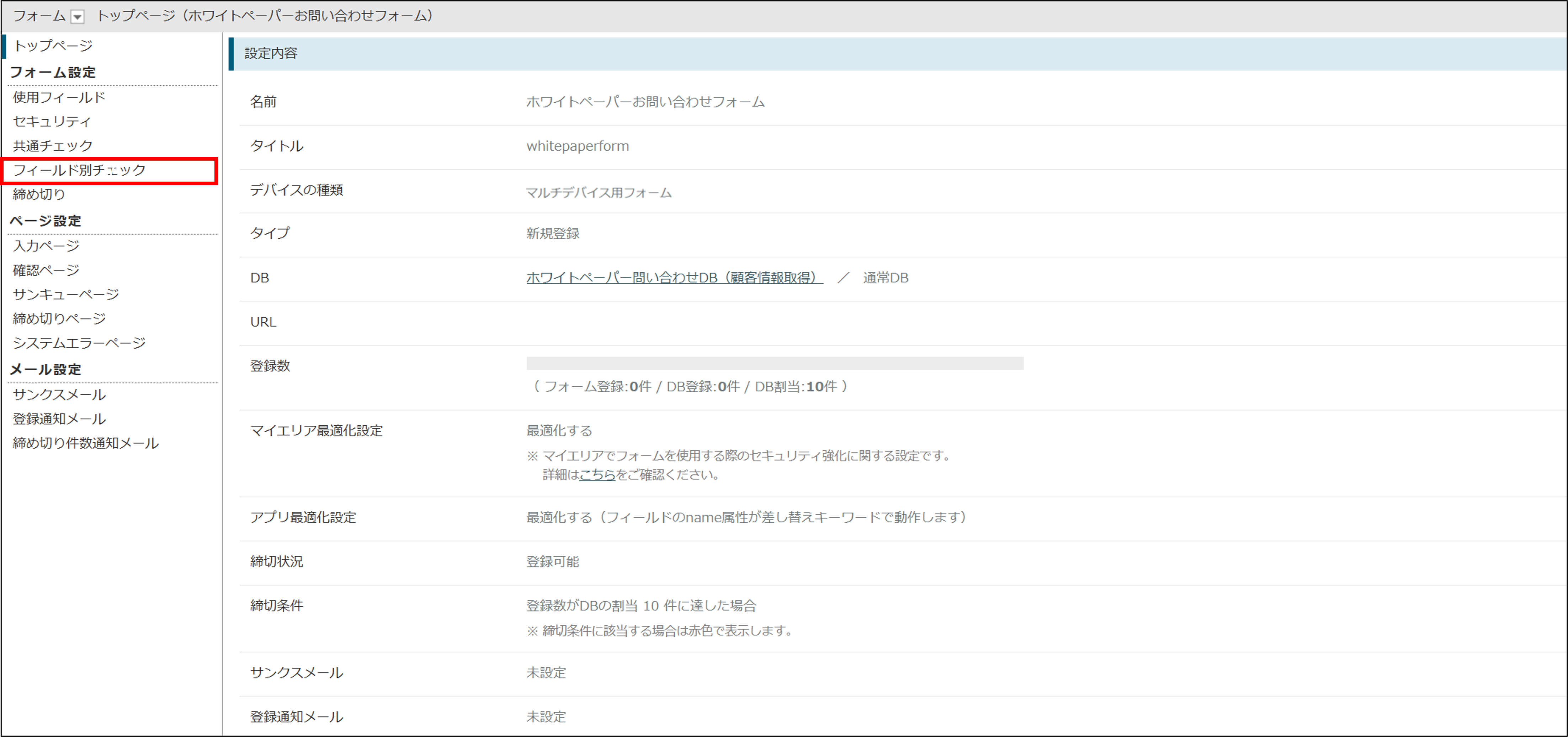続いて、フィールド別の詳細設定を行います。「MENU」>「フォーム設定」の「フィールド別チェック」に進みます。