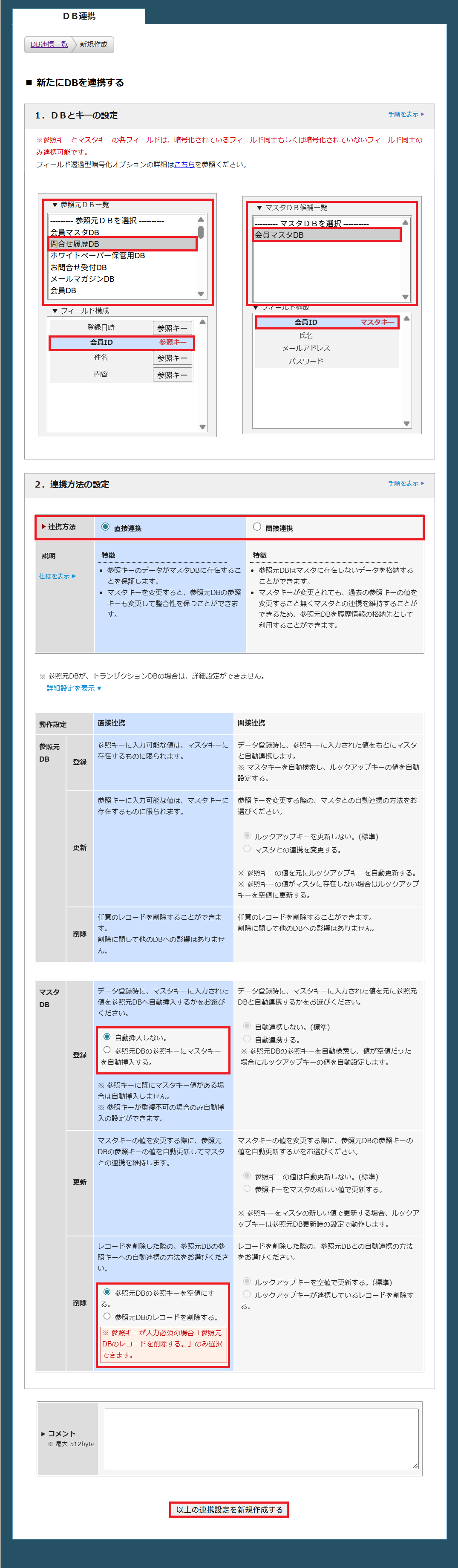 ここでは、「DB連携とは」を参考に、直接連携でDB連携を行う設定手順についてご紹介します。DB連携一覧では、DB連携の新規作成と既に設定されたDB連携の確認を行うことができます。[新たにDBを連携する]ボタンをクリックすると、DB連携を新規に作成する設定画面に遷移します。