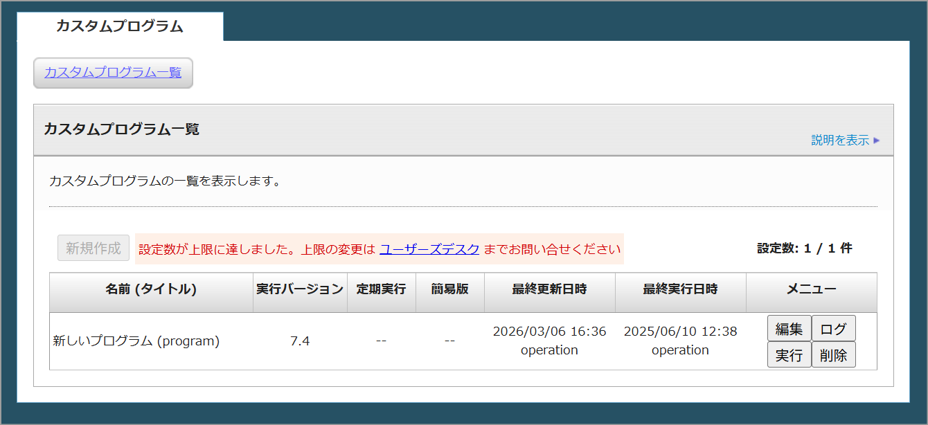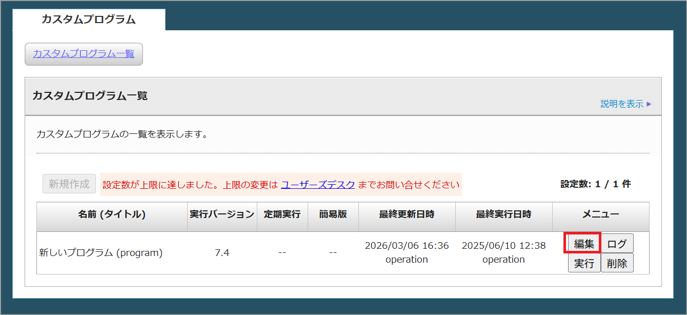 カスタムプログラム一覧から「編集」ボタンをクリックします。