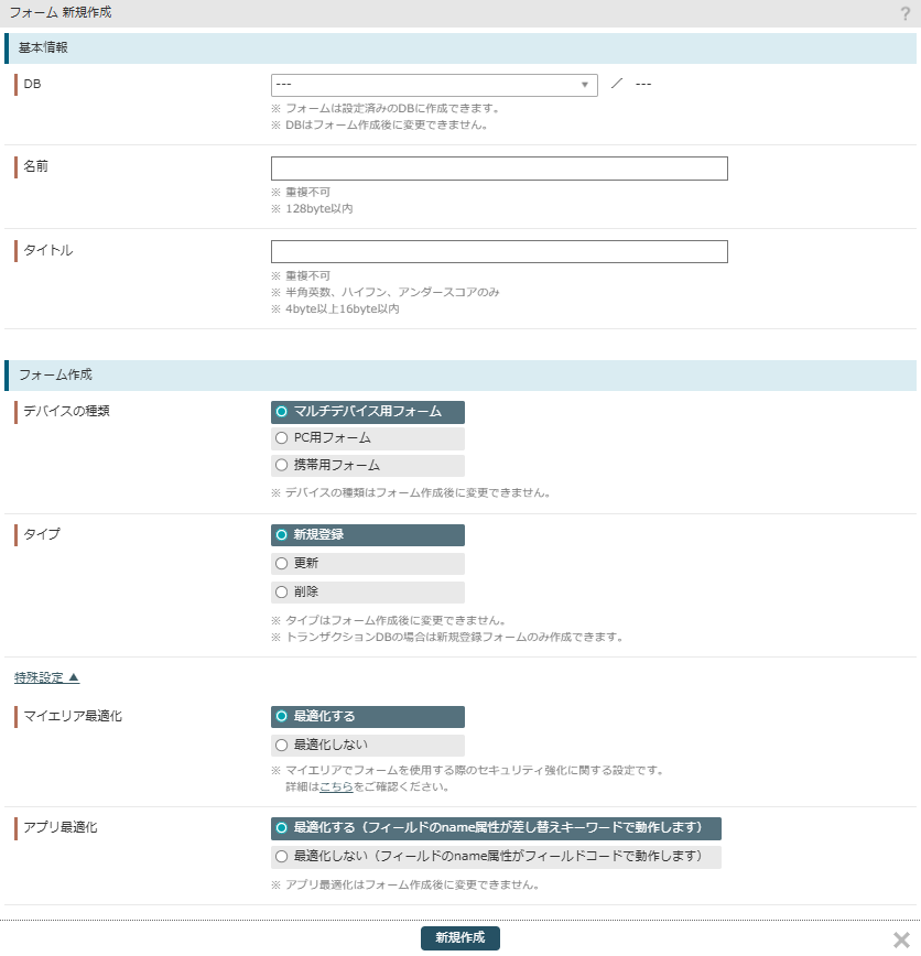 フォームの新規作成画面が現れるので、設定を行い「新規作成」ボタンをクリックします。