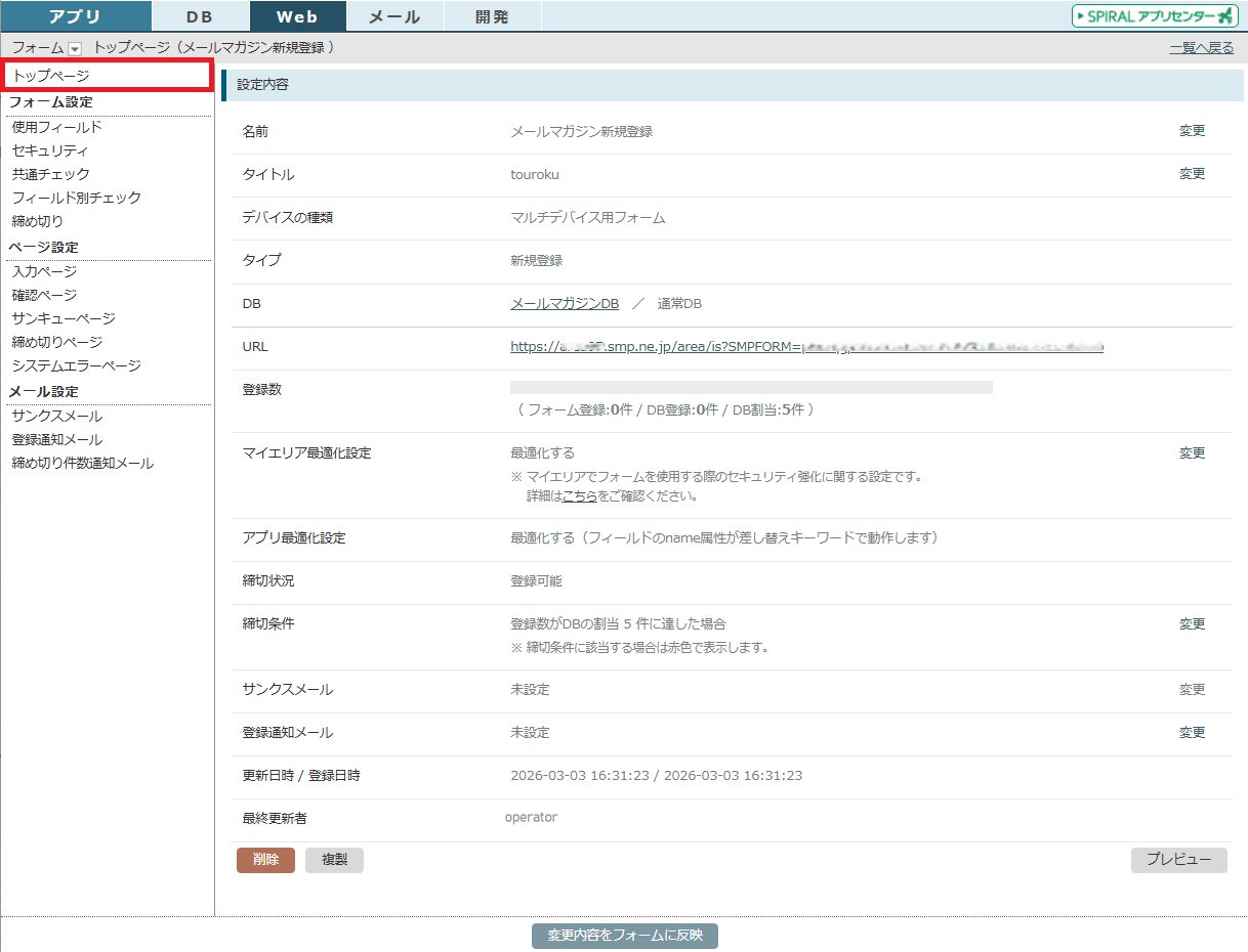 フォーム一覧からフォーム名をクリックすると、設定のトップページが表示されます。