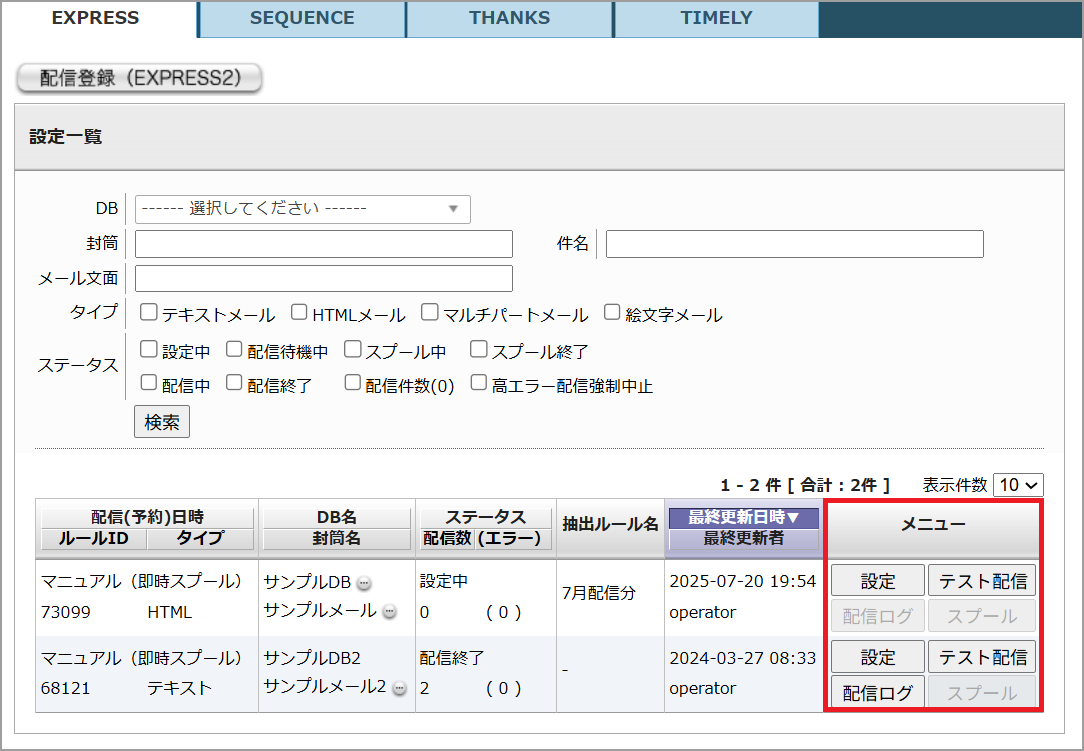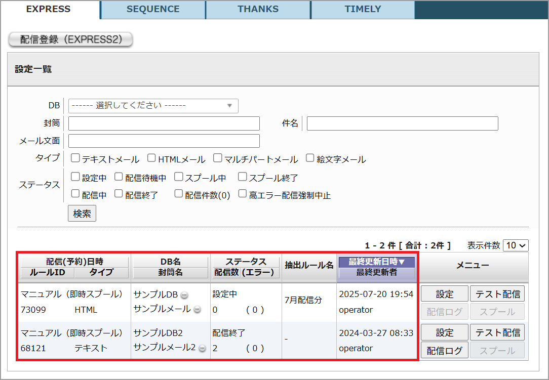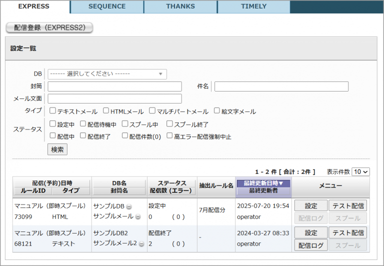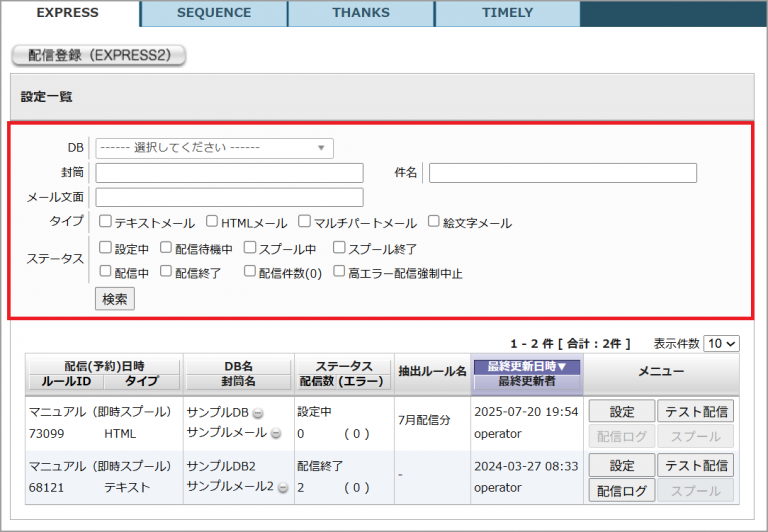 「DB」、「封筒名」、「件名」、「メールタイプ」、「ステータス」の項目で配信設定の検索をすることが可能です。