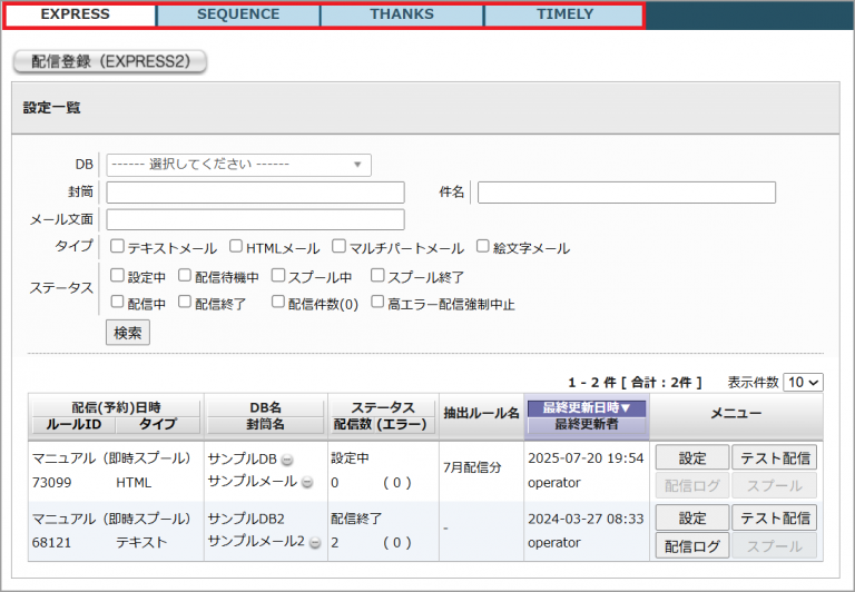 「EXPRESS」「SEQUENCE」「THANKS」「TIMELY」の各タブをクリックすることで各メール機能の配信設定を確認することができます。
