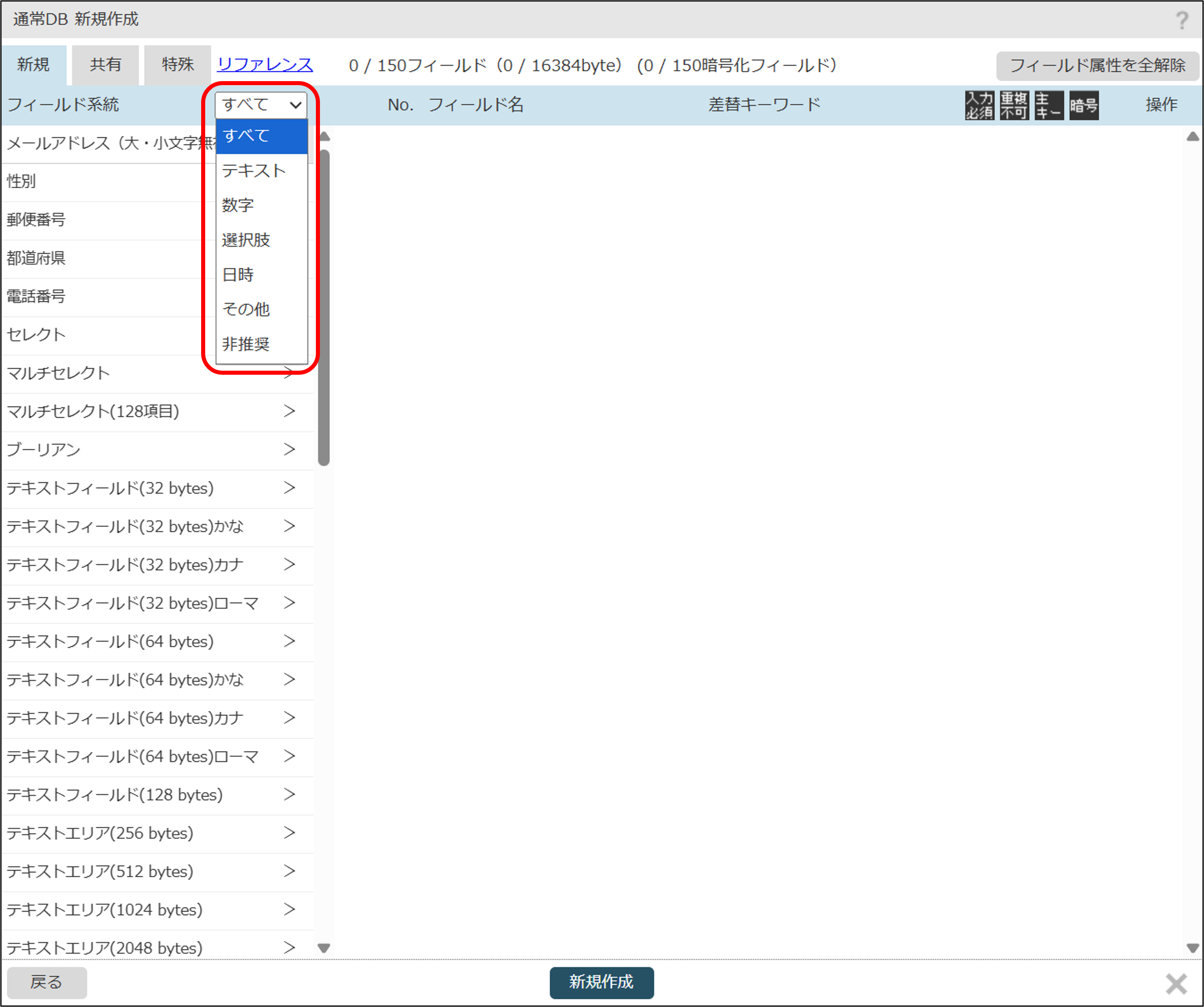 - フィールド数の上限は「150個」、全フィールドのレコードサイズ合計の上限は「16,384bytes」です。