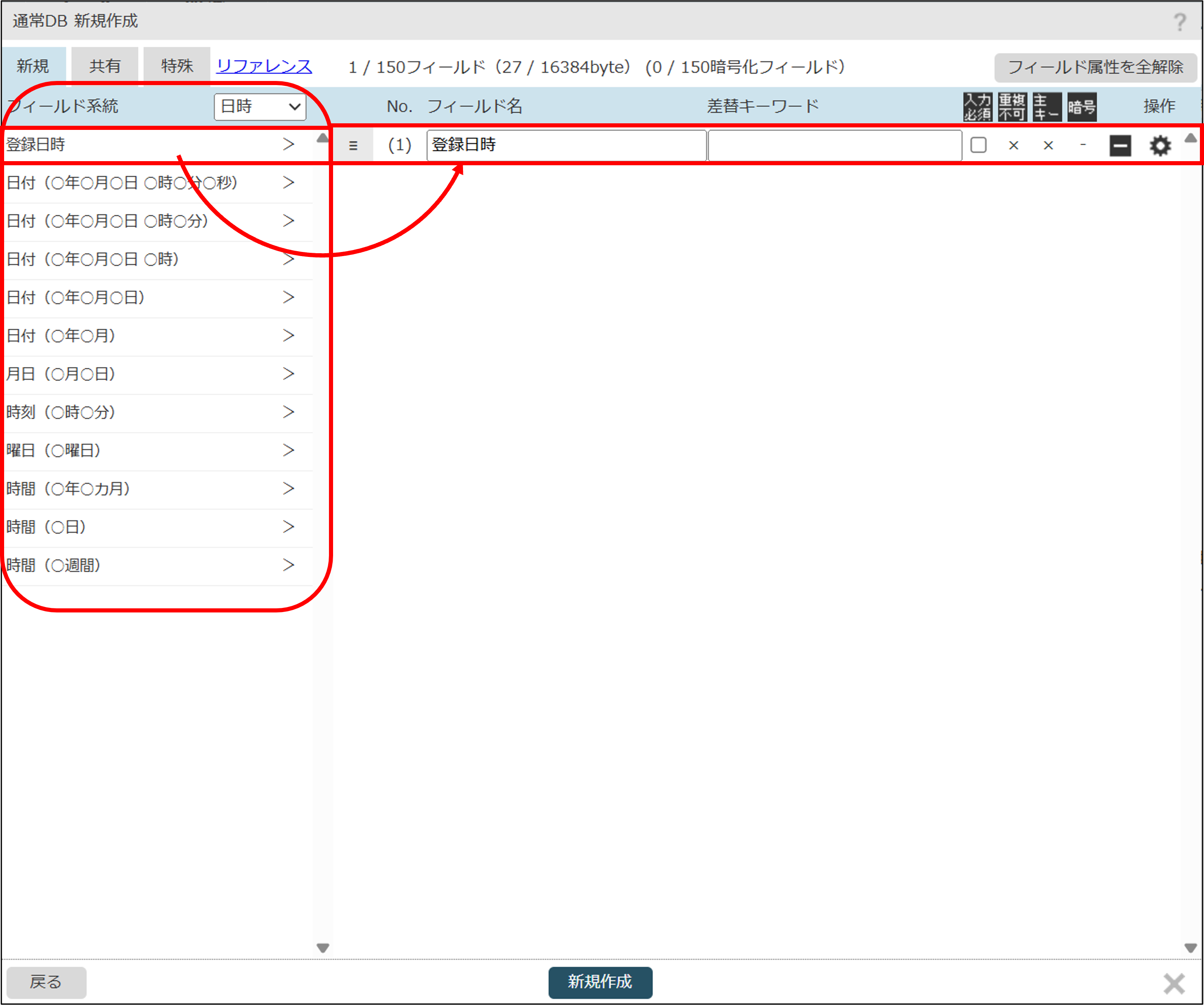 例えば、「日時」カテゴリでフィールドを絞り込み、「登録日時」フィールドを選択・追加します。