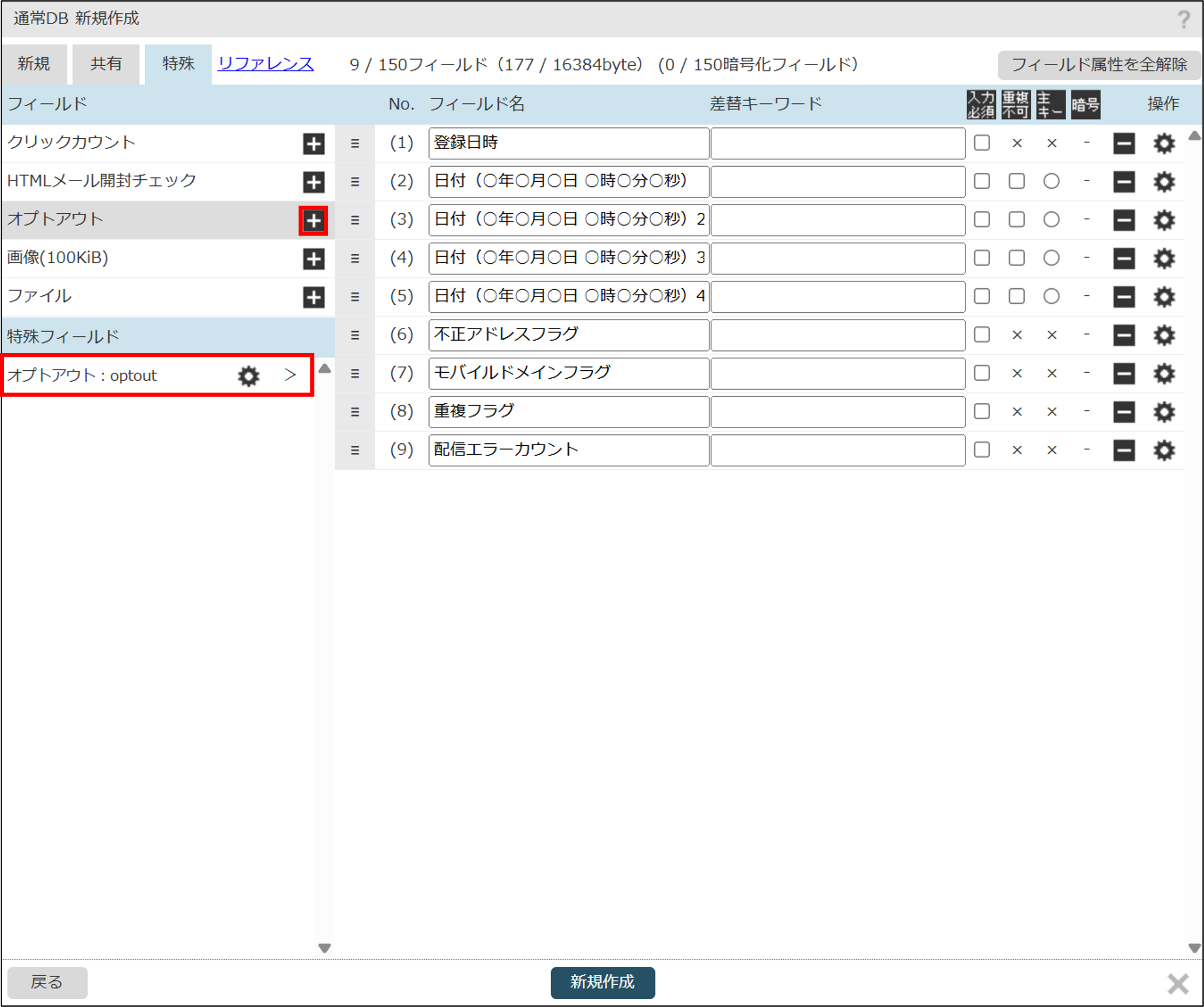 「特殊」フィールド(「クリックカウント」「開封チェック」「オプトアウト」等)を追加するためには、あらかじめフィールドの設定が必要です。各フィールドの「+」をクリックしてフィールド設定を終えた後、追加することができます。