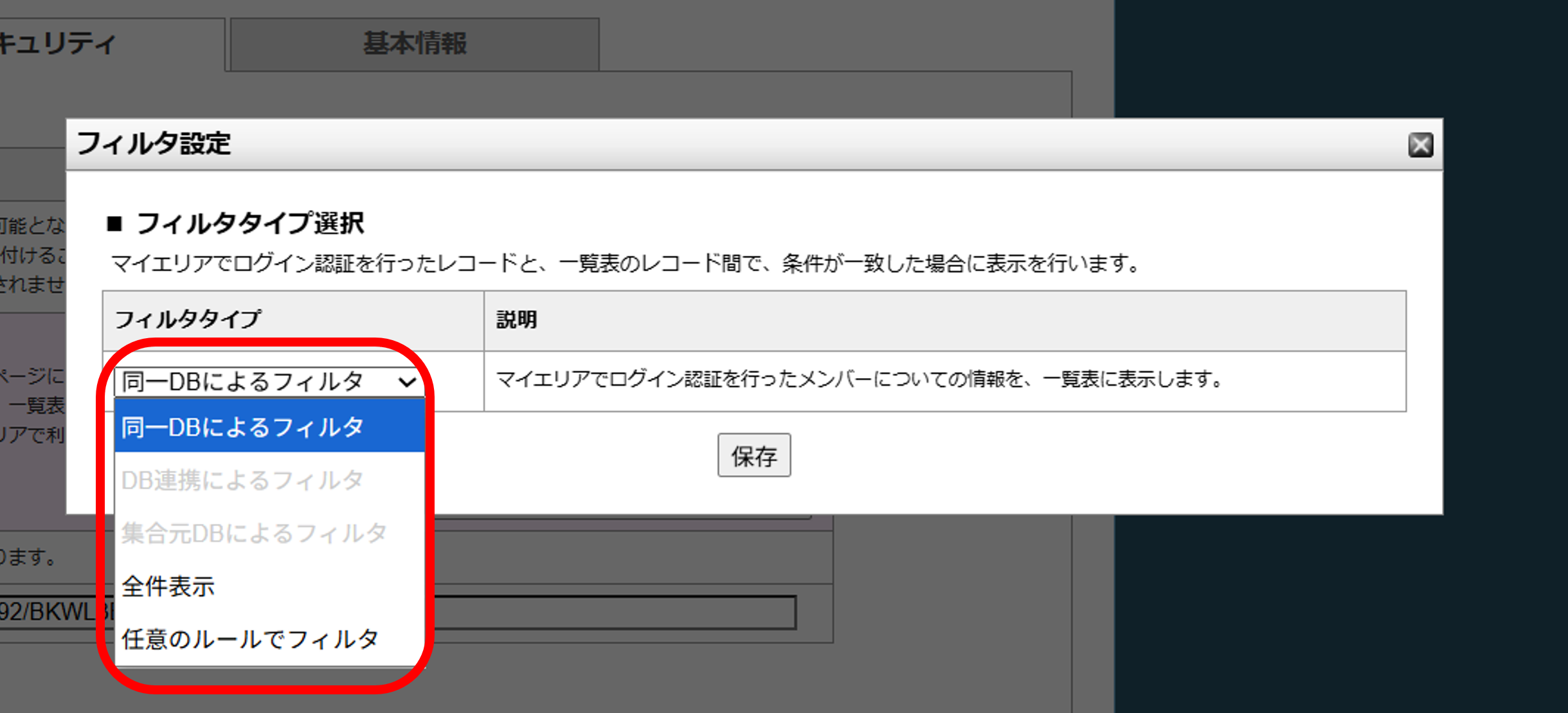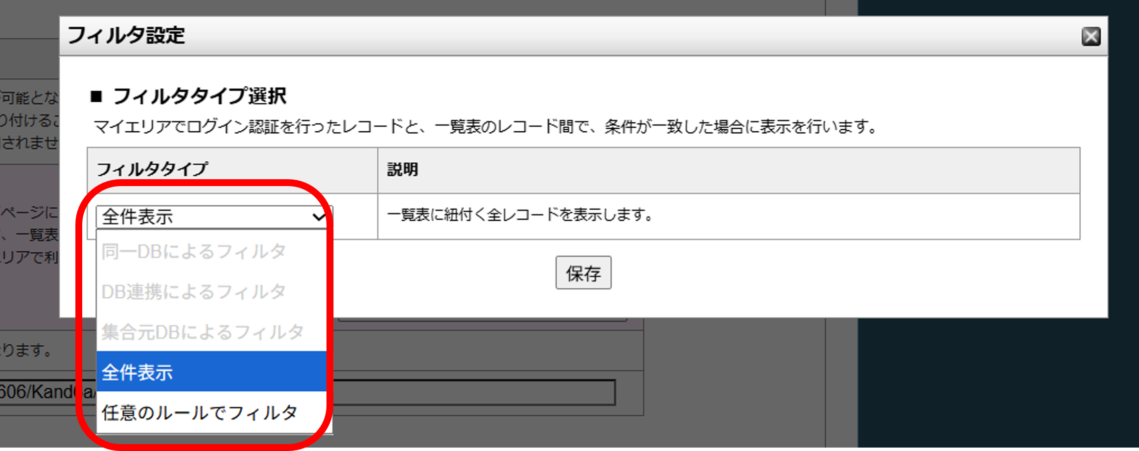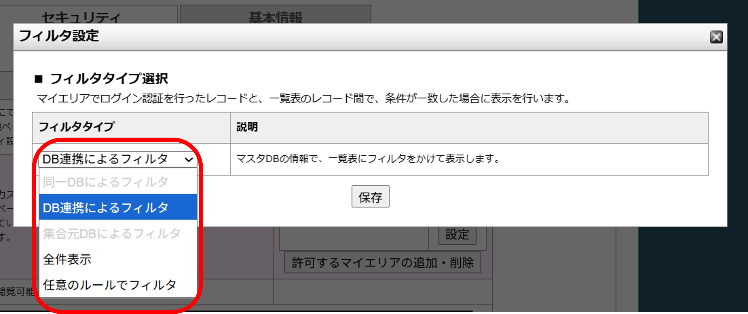 →表示するDBの中から、マイエリアで認証した1レコードに関連するレコードのみをフィルタして表示します。
