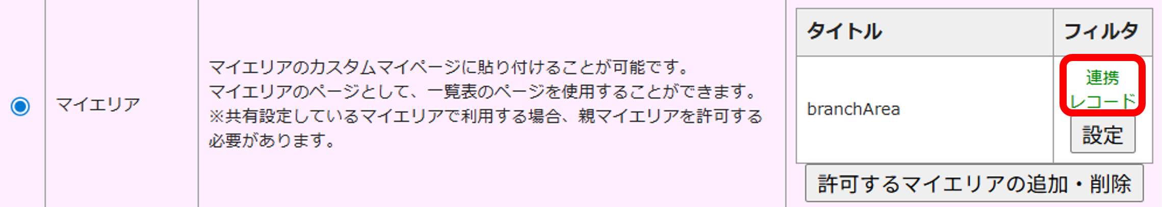 アクセス権限をマイエリアに設定すると、該当の一覧表の設定が許可したマイエリアの「マイエリア許可ページ」に追加されます。