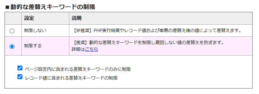 「ページ設定内に含まれる差替えキーワードのみに制限」および「レコード値に含まれる差替えキーワードの制限」にチェックがつきます。