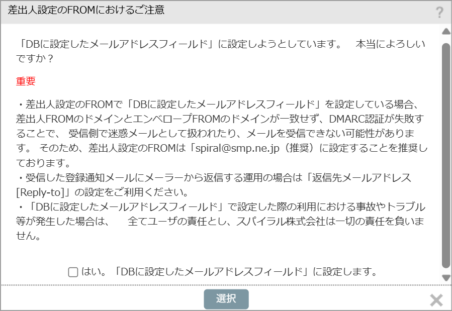 「FROM」にDBに設定されているメールアドレスフィールドを指定している場合に、