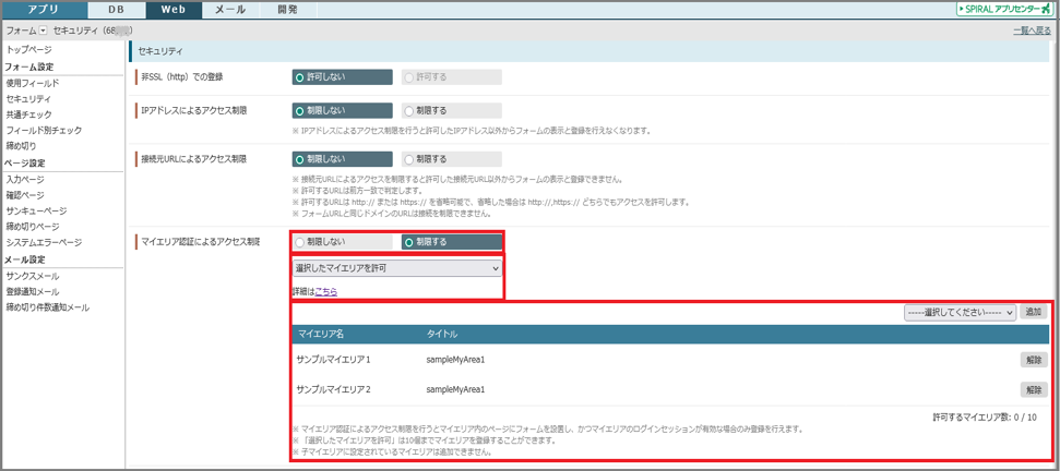 「選択したマイエリアを許可」では、フォームへのアクセスを許可するマイエリア(許可マイエリア)を登録できる機能を追加して、