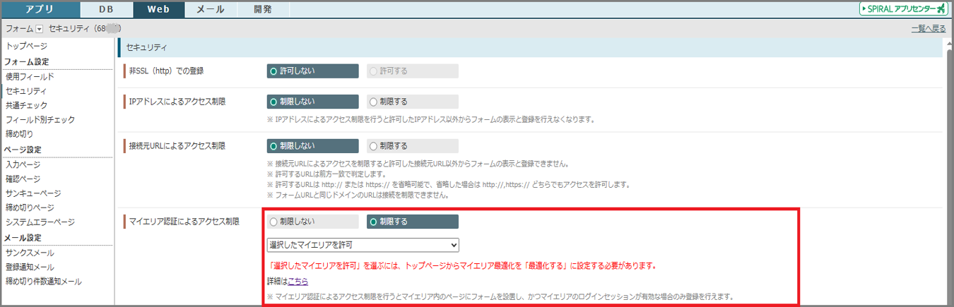 セキュリティ向上のため、フォームのセキュリティ設定「マイエリア認証によるアクセス制限」を「制限する」に設定した際、